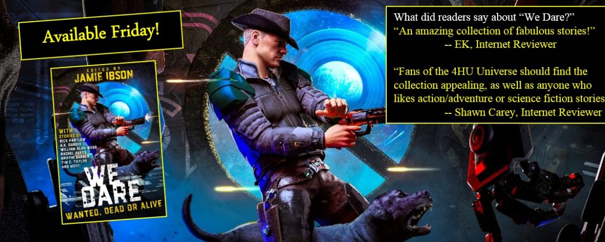 This Friday (May 6th) sees “FRAkkers”, my mutant bounty hunter anti-hero story in We Dare: Wanted, Dead or Alive out Friday. His cyborg sidekick will hopefully get her own story released in another anthology later this year. What can I say? Strontium Dog meets Gill “the ARM” Hamilton with aliens like you’ve never seen before.