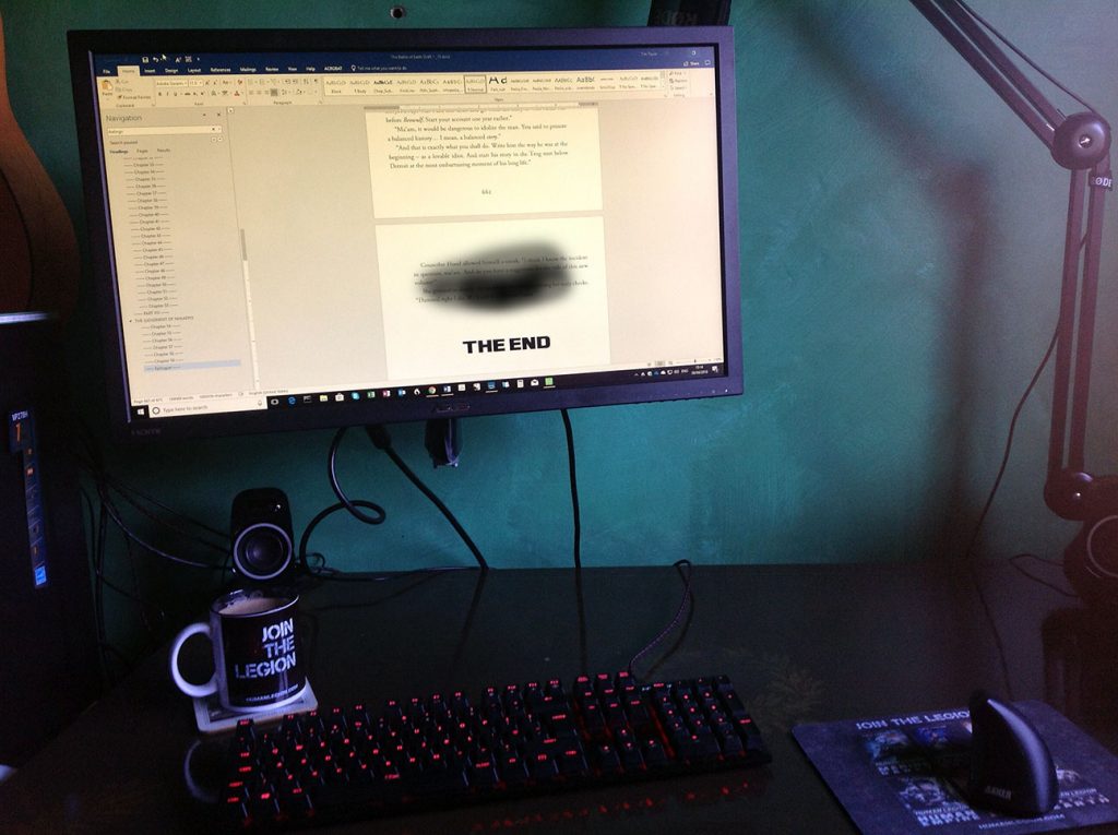 I don’t normally type THE END, but it seemed fitting this afternoon, because today I finished writing the Human Legion. When you add in the spin off series, including the mighty Sleeping Legion from JR Handley, then once these final books are published, that will take it to 1.6 million published words in the Human Legion Universe. To put that in perspective, Jim Butcher’s Dresden Files novels weigh in at just under 2 million words, Harry Potter is 1.1 million (with 260,000 for Order of the Phoenix alone … I knew that book went on a bit!), and 1.25 million for Iain M. Banks’ Culture books.