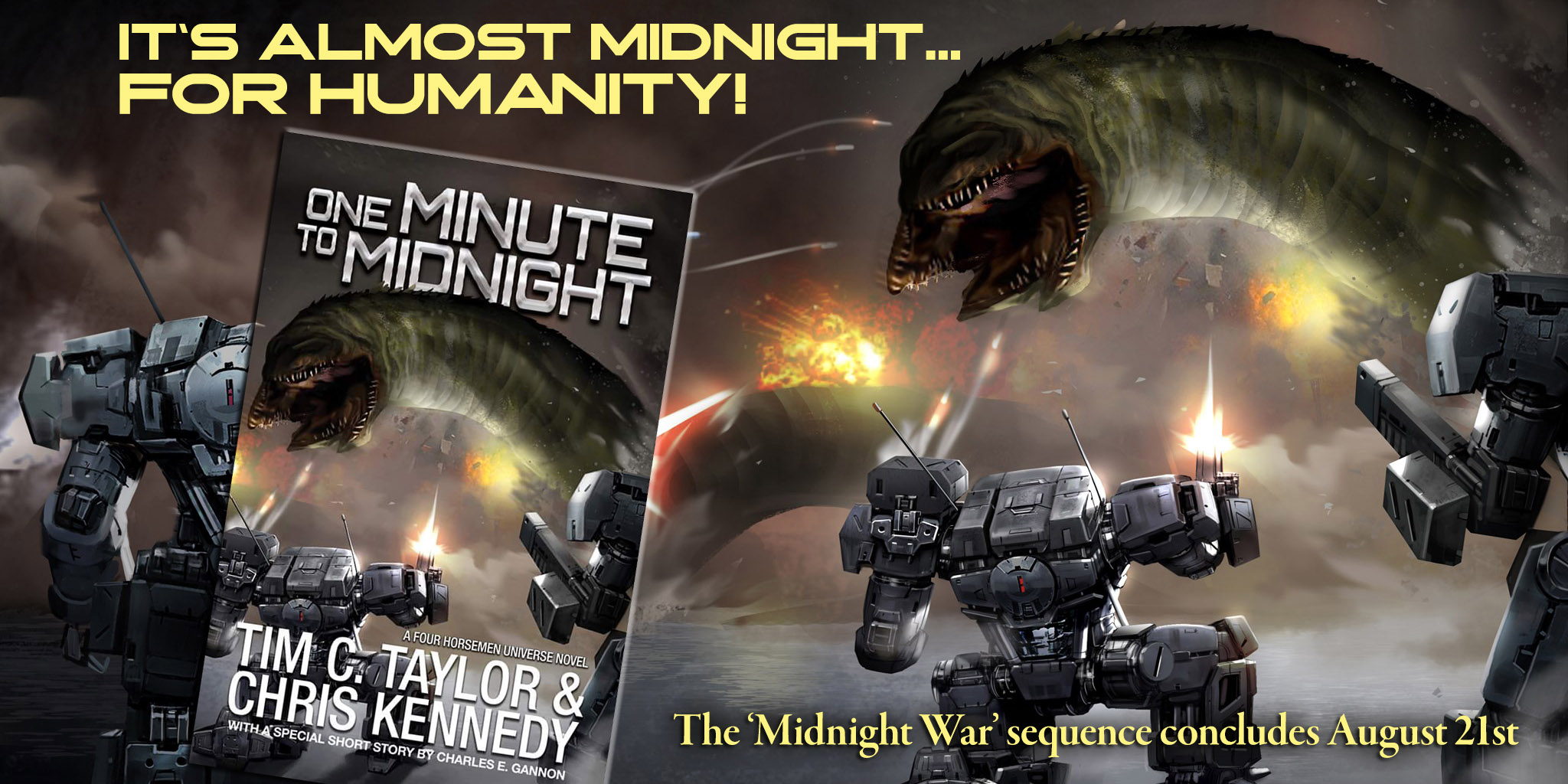 - August 21st: will be ‘One Minute the Midnight’, a novel I’ve almost finished co-writing with Chris Kennedy. This will cap the run of four ‘Midnight Sun’ novels and three novelettes I’ve been writing the last three years, and it’s absolutely cracking.