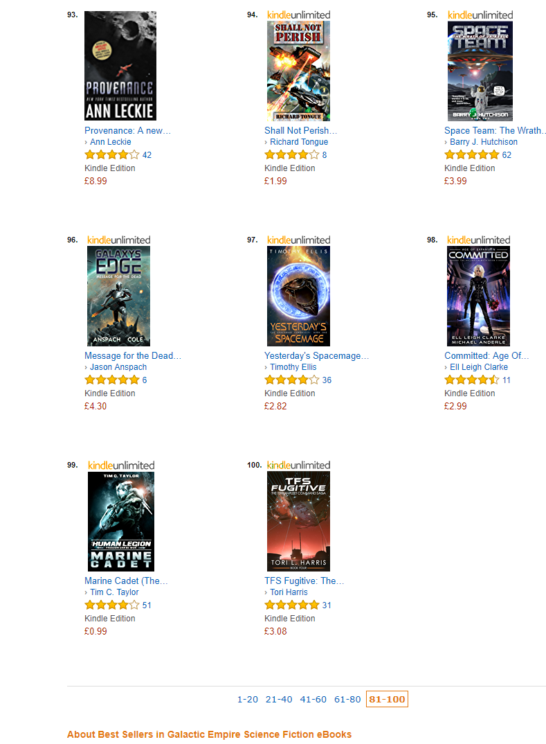 A great surprise is that the older Legion books are starting to sell a little more: enough to get in a few Amazon charts. Here’s the view from the amazon.co.uk Galactic Empire chart this morning, which was also gratifying because I’ve met three of these authors in person, and chatted with a couple more online.